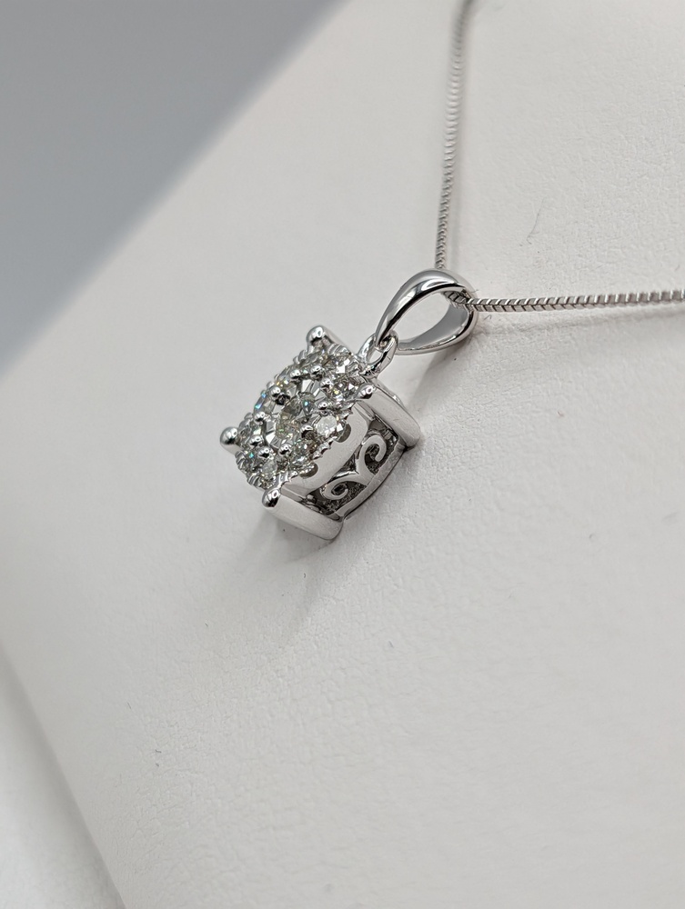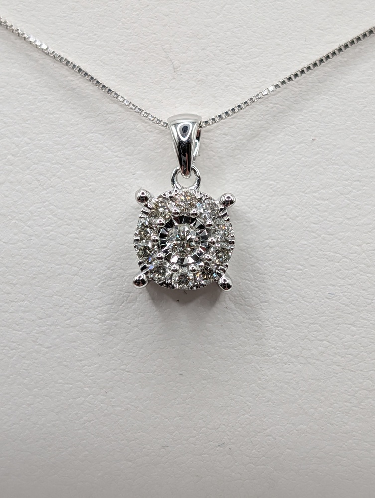 14kt White Gold ~.25 Total Carat Weight G Color; VS2 Clarity Round Brilliant Cut Diamond Cluster 3/8" Pendant - 1.90 Grams