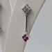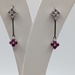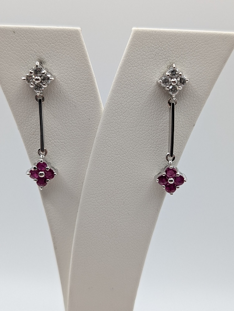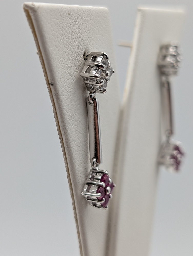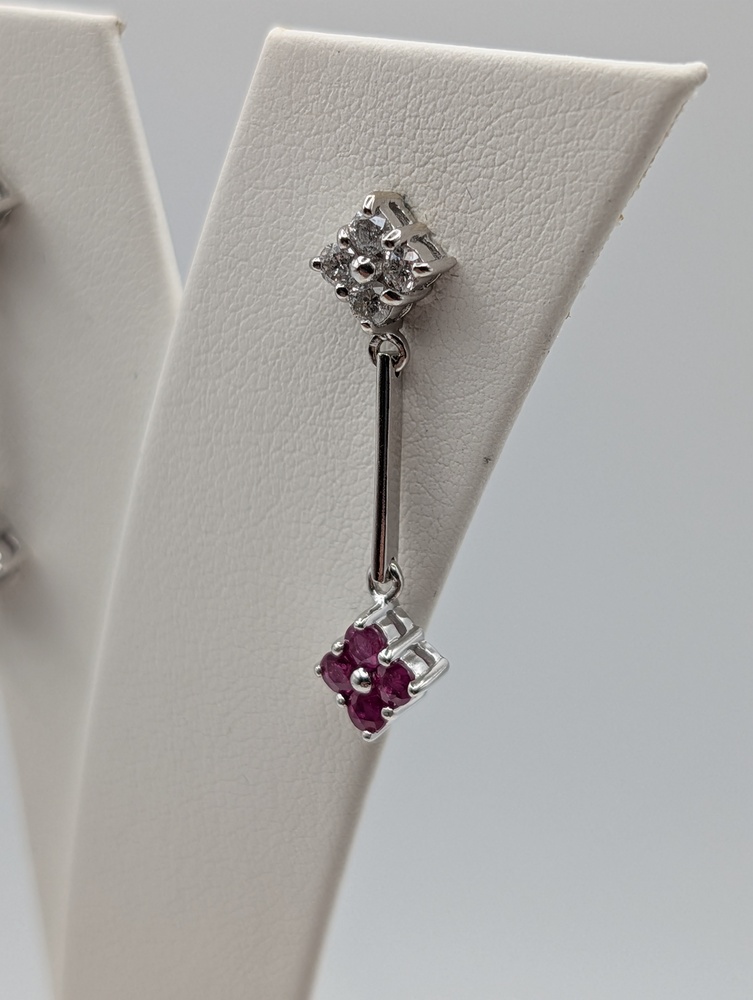14kt White Gold ~.24 Total Carat Weight Round Ruby Cluster With ~.16 Total Carat Weight Round Diamond Cluster 1" Bar Dangle Post Earrings - 3.30 Grams