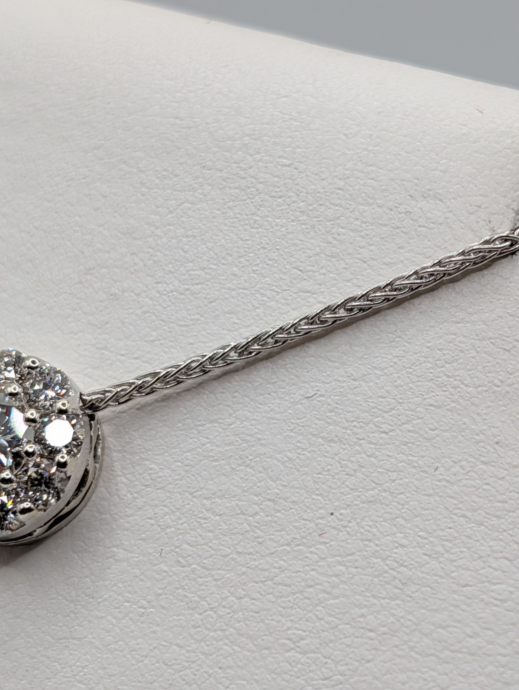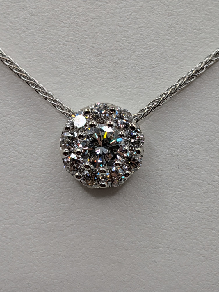 14kt White Gold ~.90 Carat F Color; VS1 Clarity Round Brilliant Cut Diamond Center With ~.60 Total Carat Weight Halo 1/2" Round Slider Pendant on 16" 1.2mm Franco Link Chain Necklace - 5.50 Grams {Chain Included}