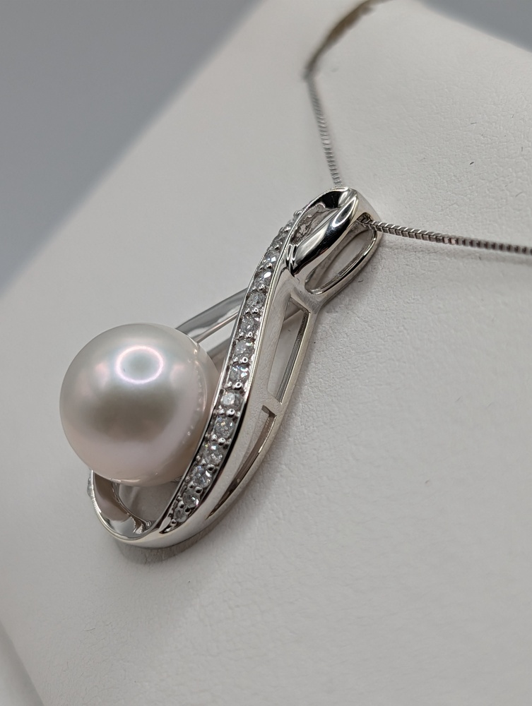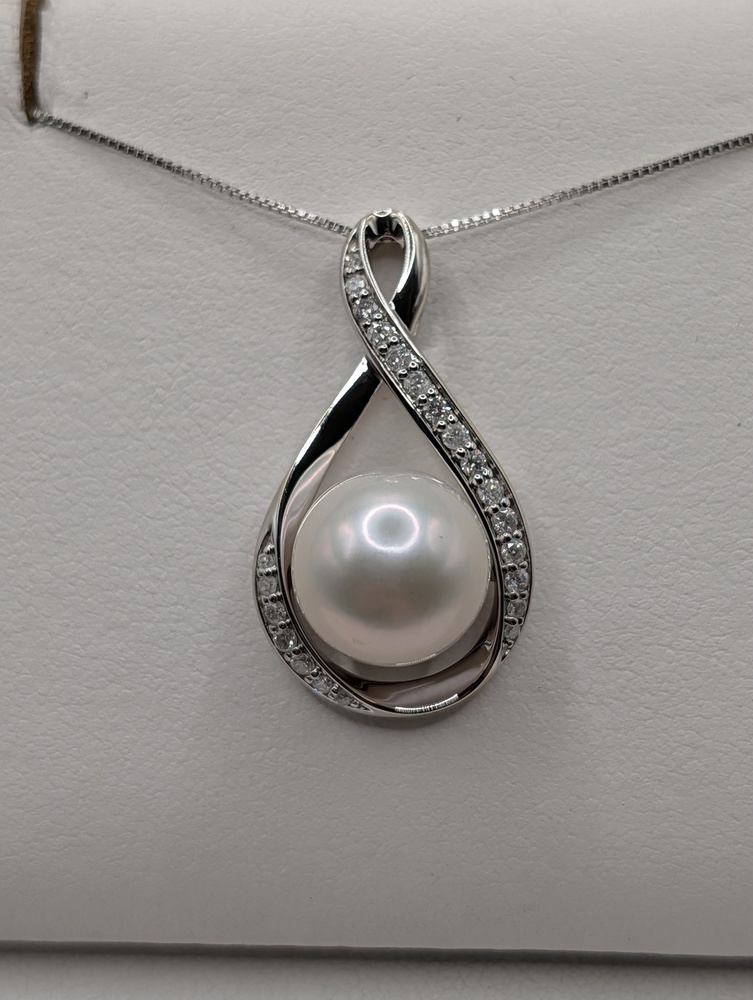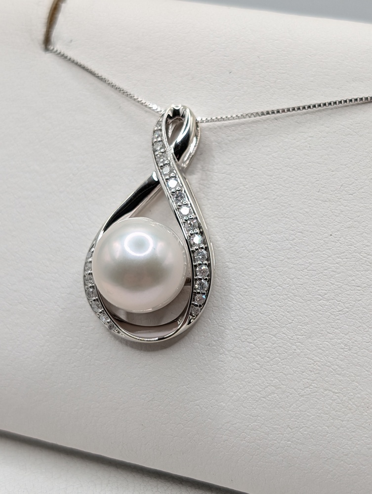 14kt White Gold ~11mm White Pearl With ~.15 Total Carat Weight Round Diamond Accent 1 1/8" Pendant - 4.80 Grams   [Chain Sold Separately]