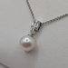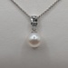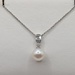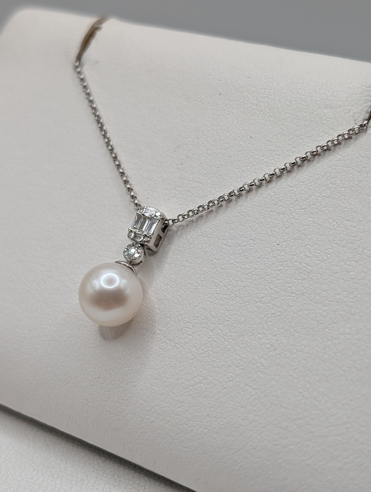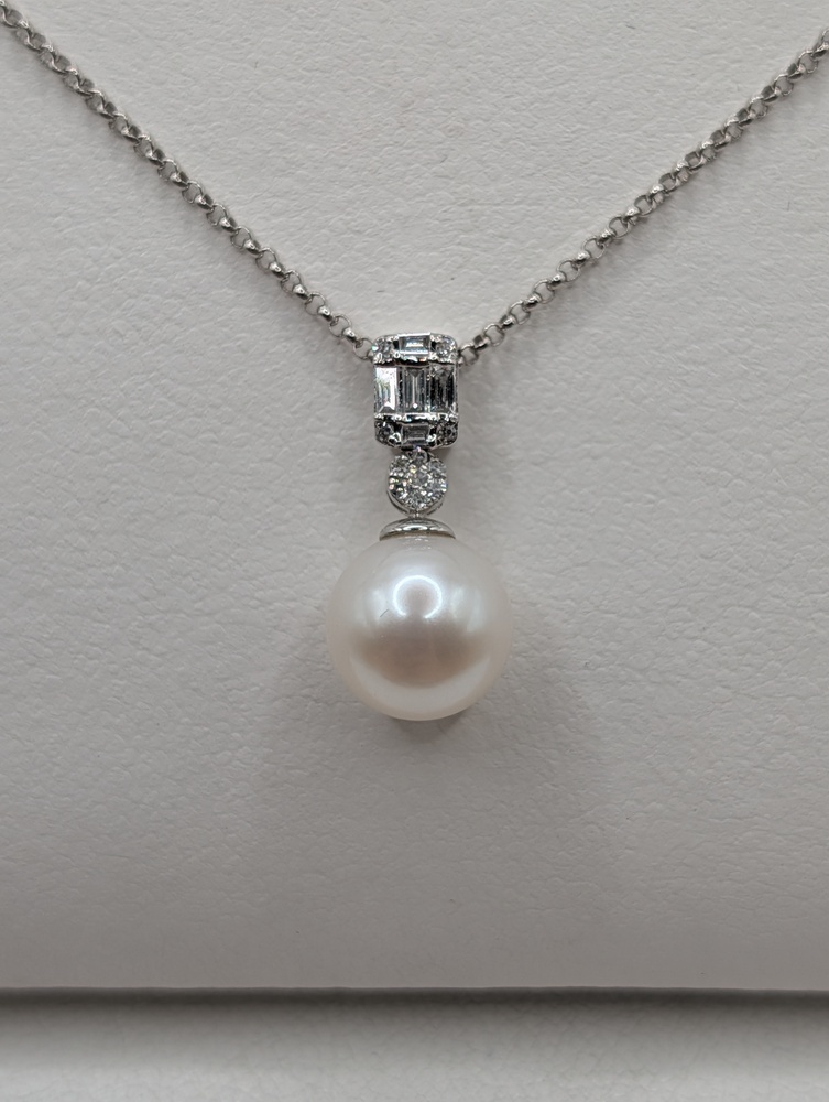 14kt White Gold ~8mm White Pearl With ~.20 Total Carat Weight Baguette and Round Cut Diamond Accent Bale 3/4" Pendant on 16" to 18" Adjustable Thin Rolo Link Chain Necklace - 3.20 Grams {Chain Included}
