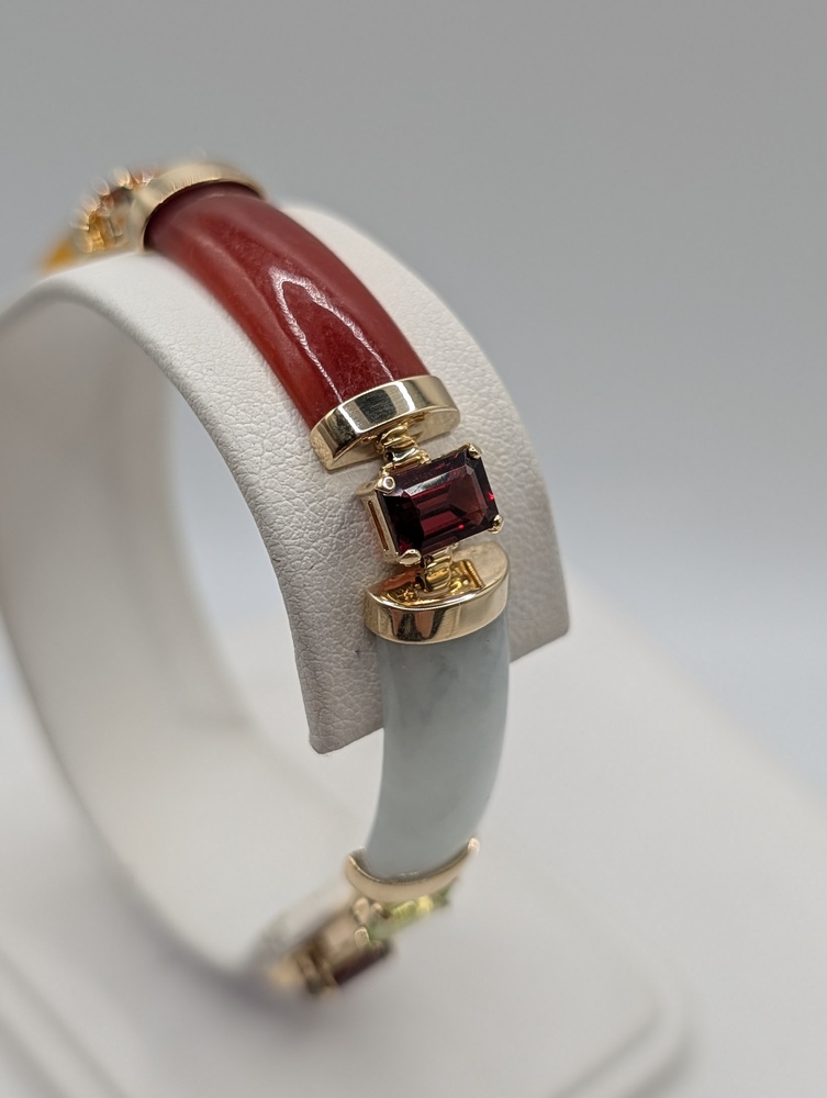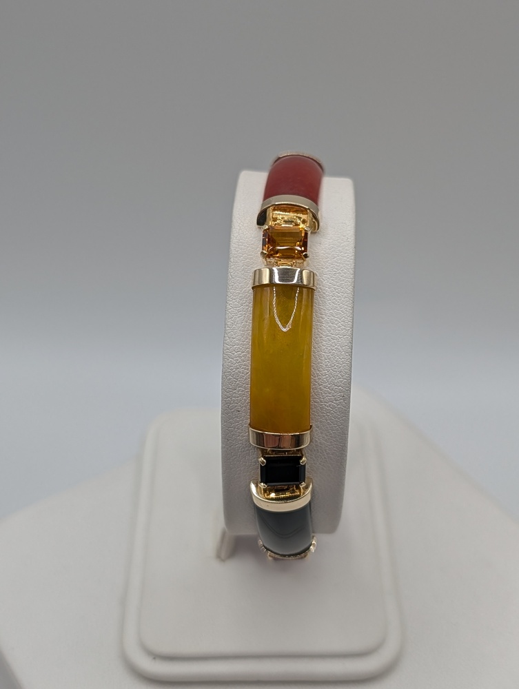 14kt Yellow Gold Multi-Colored Jade Bars With Peridot, Garnet, Citrine, Onyx and Amethyst Emerald Cut Gemstone Accents 7 1/2" 9.8mm Link Bracelet - 17.50 Grams