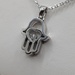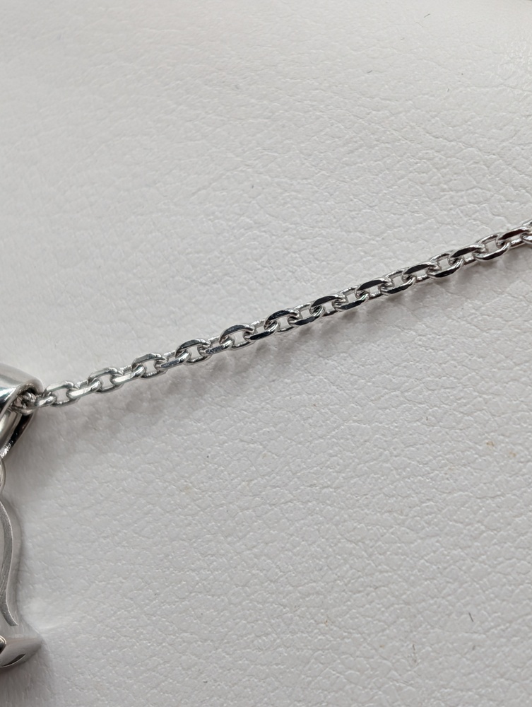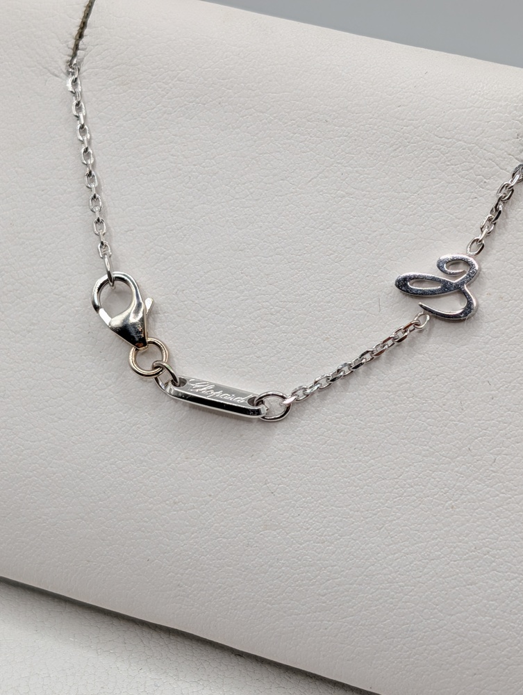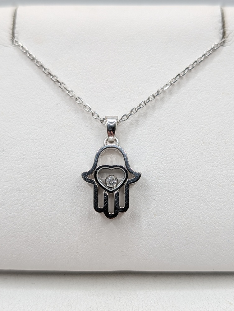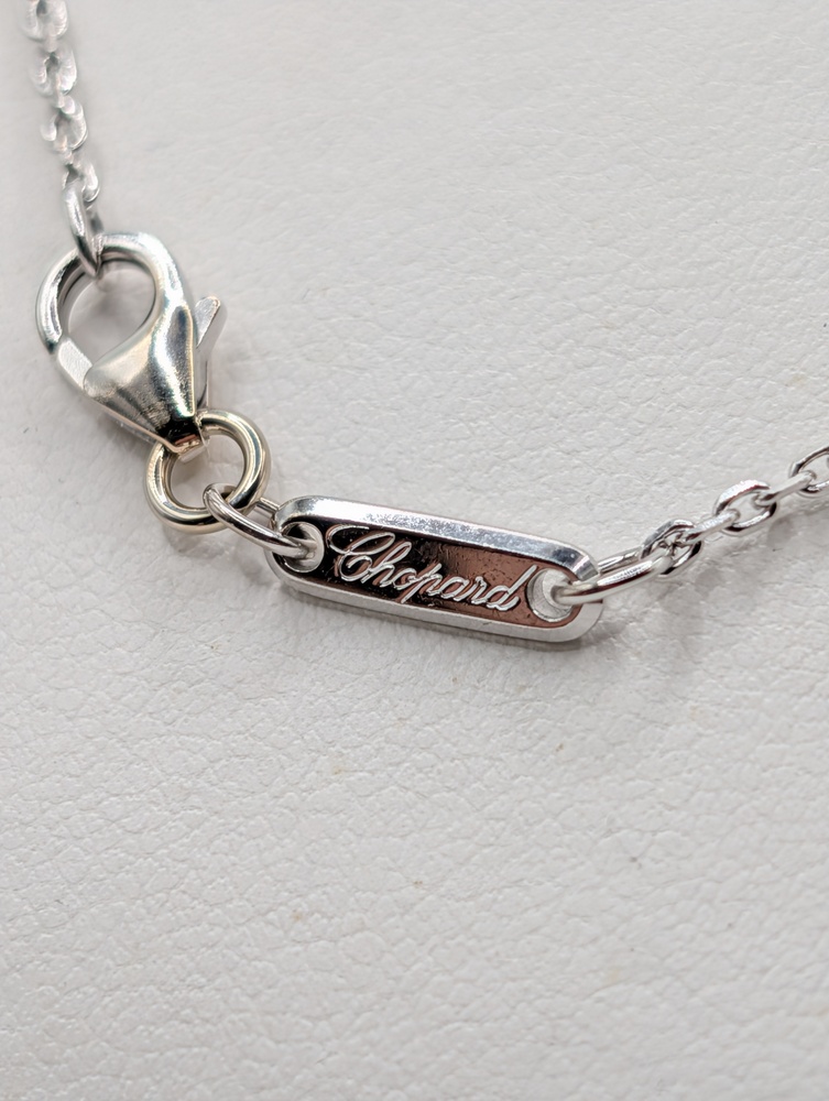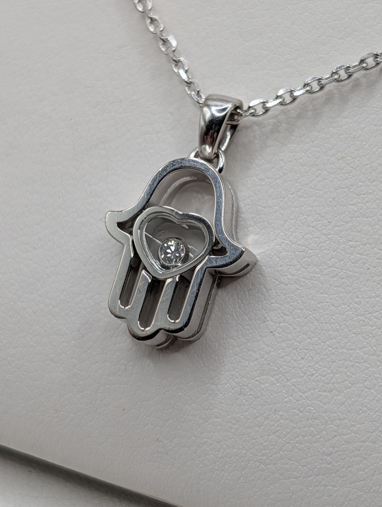 18kt White Gold Second Hand Chopard ~.03 Carat Round Brilliant Cut Happy Diamond Hamsa Hand 7/8" Pendant on 15" to 17" 0.84mm 3-Way Adjustable Cable Link Chain Necklace - 7.90 Grams