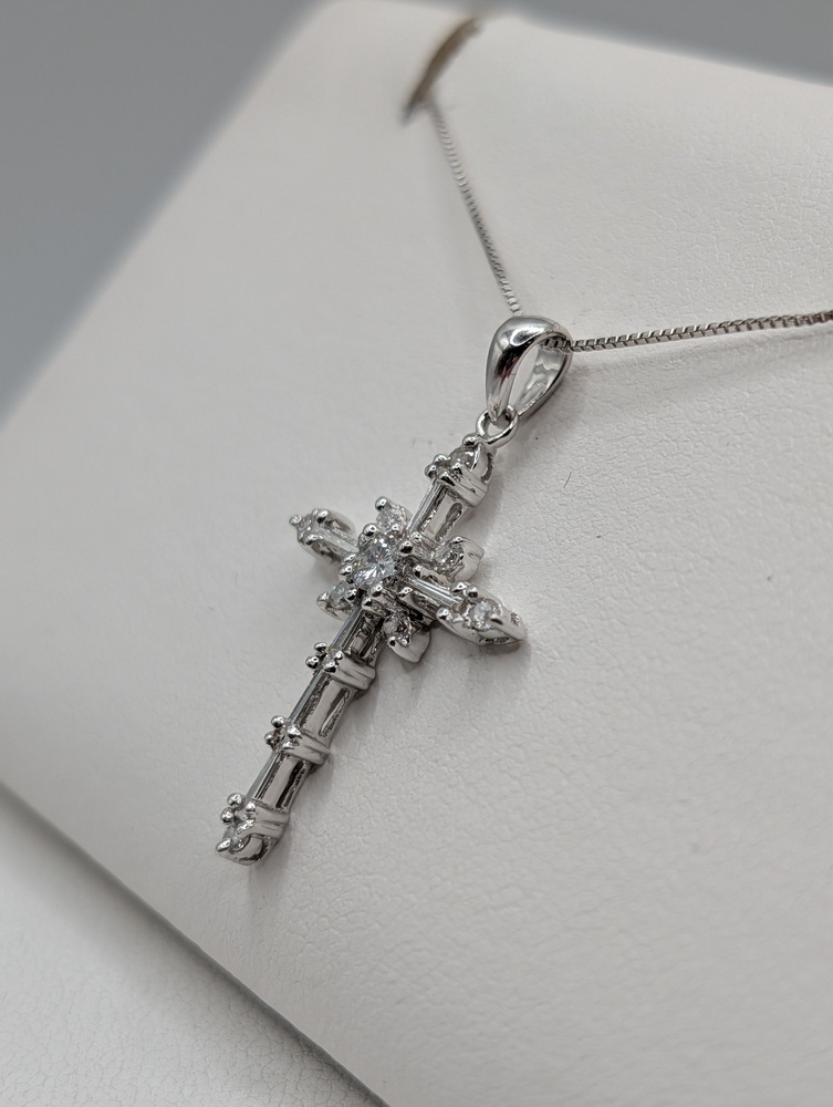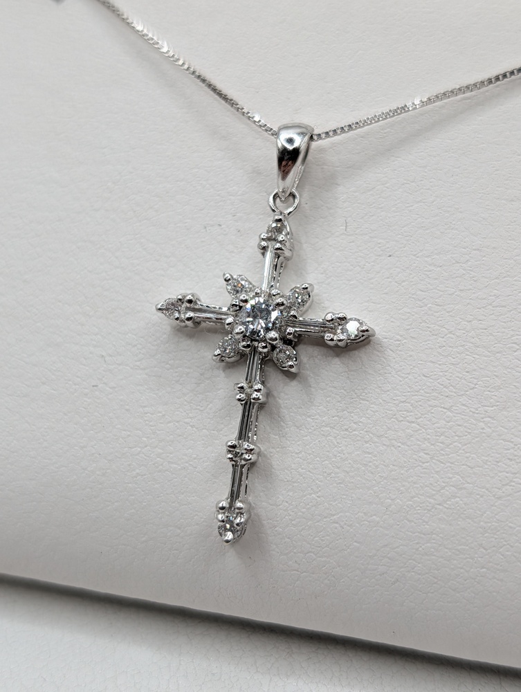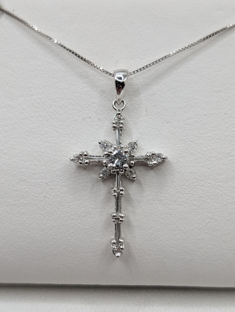 18kt White Gold ~.40 Total Carat Weight G Color; SI1 Clarity Round Brilliant Cut Diamond Accent 1 1/8" Cross Pendant - 2.70 Grams