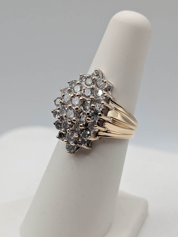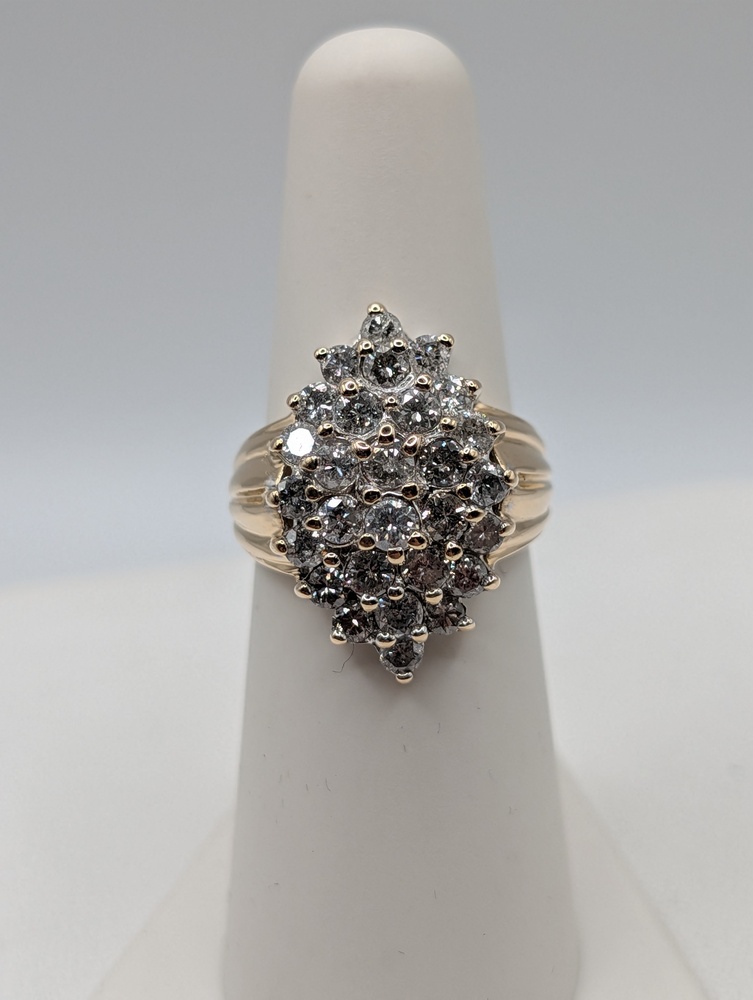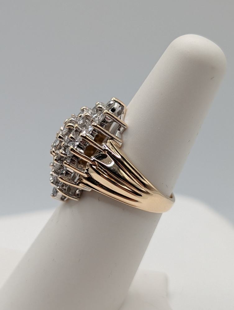 Size 6 14kt Yellow Gold ~1.5 Total Carat Weight G Color; SI3 Clarity Round Brilliant Cut Diamond Marquise-Dome Shaped Cluster Cocktail Ring - 6.50 Grams