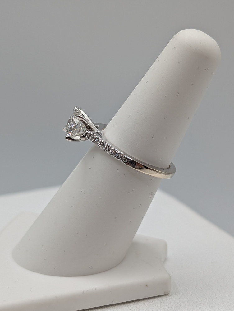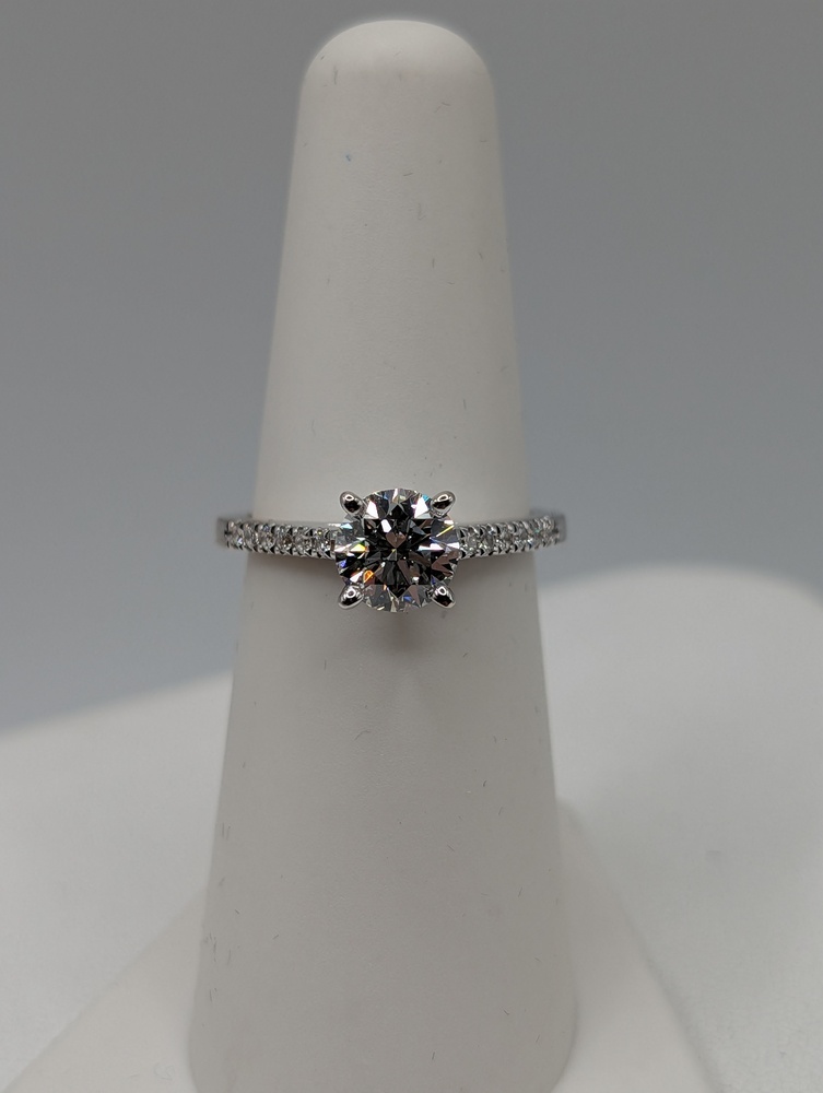 Size 6 18kt White Gold Lab Grown 1 Carat F Color; VS1 Clarity Round Brilliant Cut Diamond Center With ~.20 Total Carat Weight Natural Round Brilliant Cut Diamond Pave Set Side Accents Ring [We Do Not Buy or Loan On Lab]