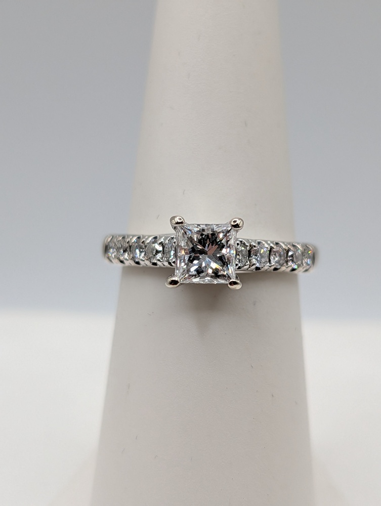 Size 6 18kt White Gold GIA Certified .70 Carat F Color; VVS2 Clarity Square Modified Brilliant Cut Diamond Center With ~.40 Total Carat Weight Round Brilliant Cut Diamond Shoulder Accents Cathedral Set Ring - 4.30 Grams