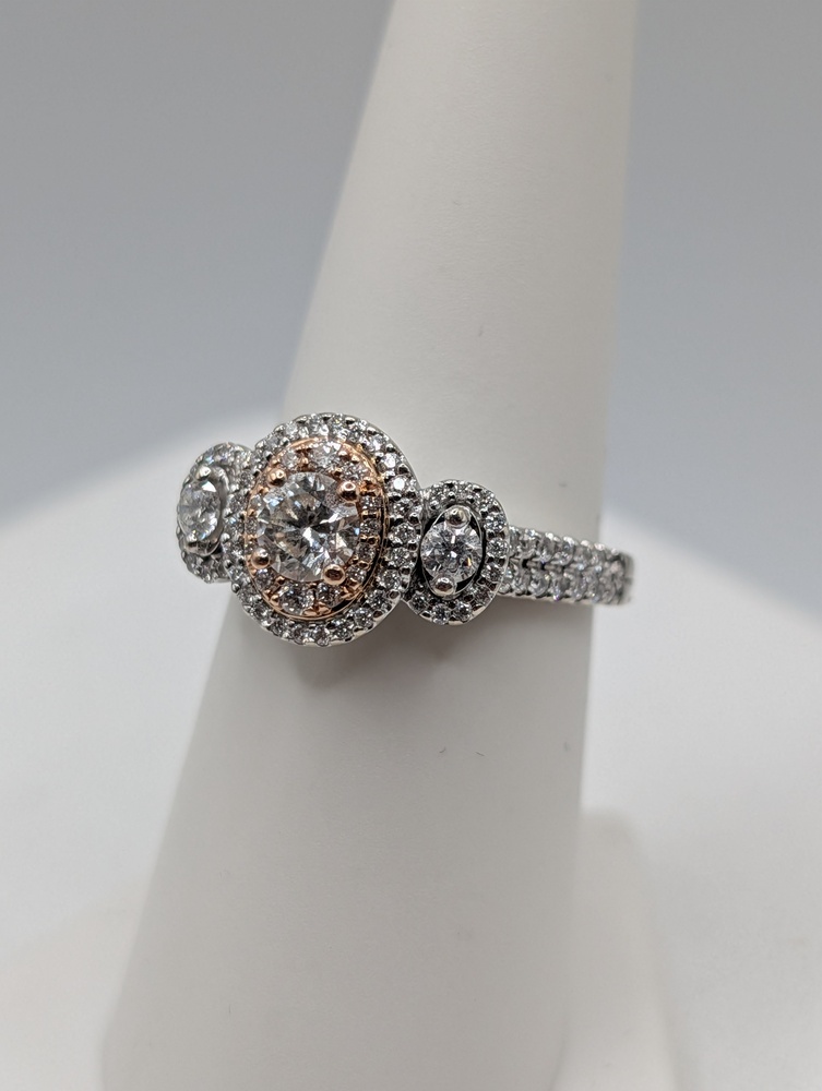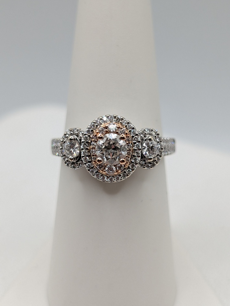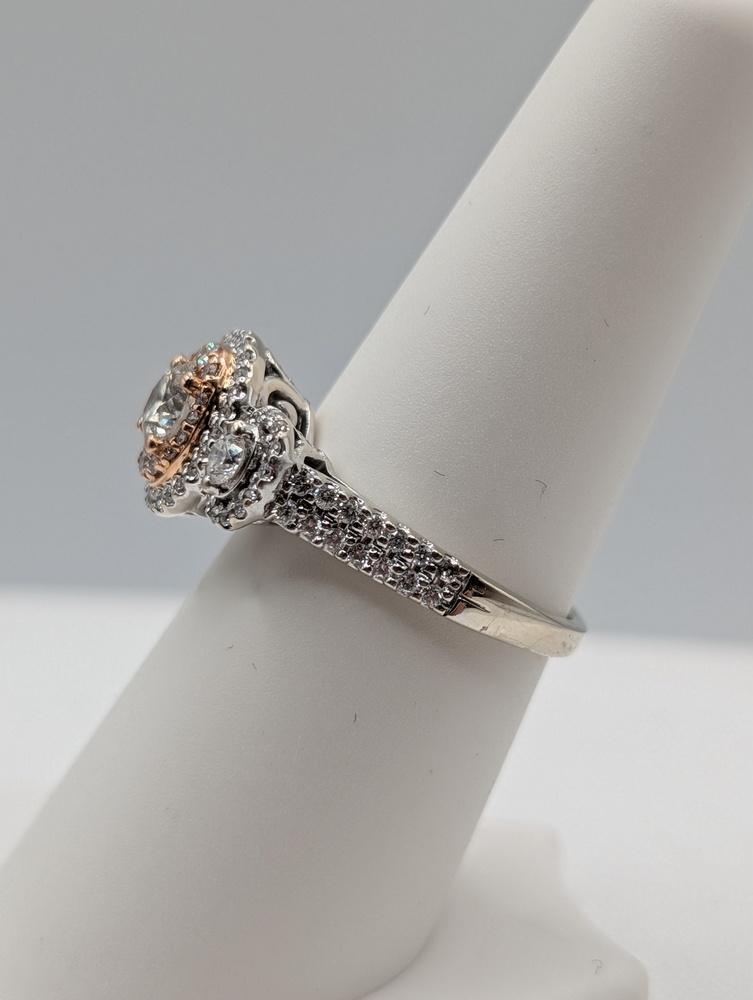 Size 7 14kt Two Tone Gold ~.25 Carat VS1 Clarity; G Color Round Brilliant Cut Diamond Center With ~.50 Total Carat Weight Round Brilliant Cut Diamond Side, Halos, Shoulders and Gallery Accents Pave Set Ring - 5.00 Grams