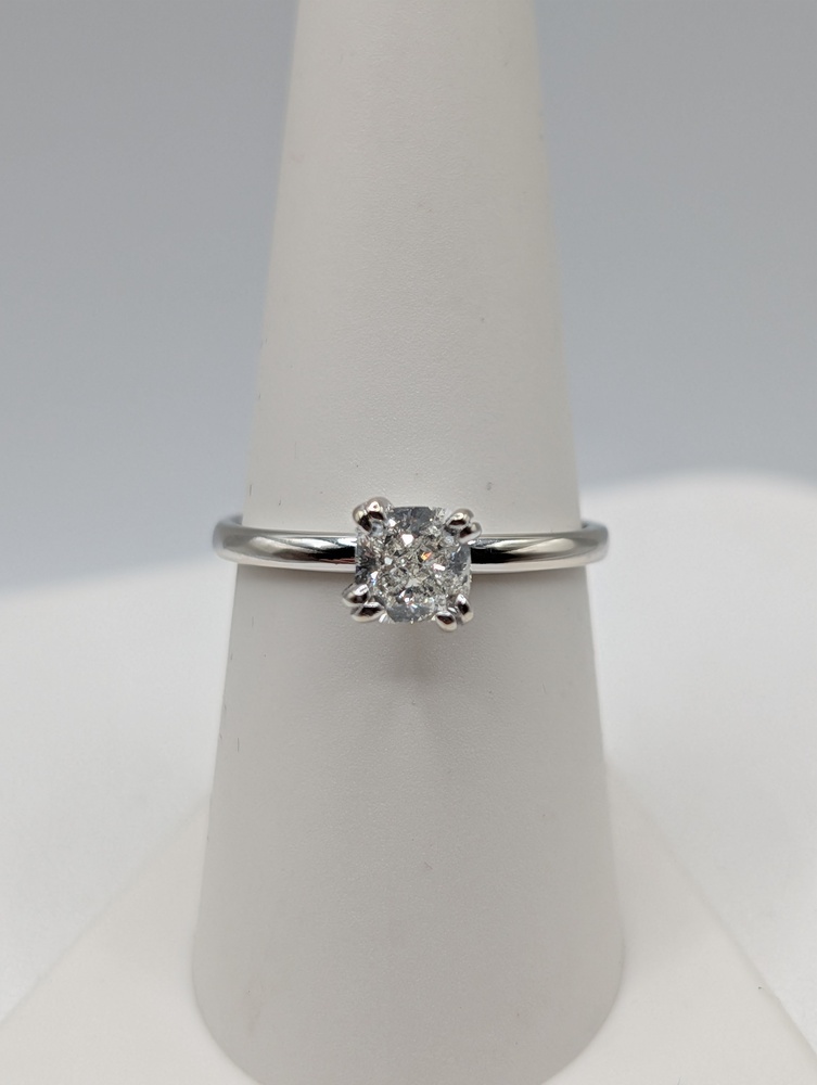 Size 7.5 14kt White Gold GIA Certified .91 Carat J Color; I1 Clarity Cushion Modified Brilliant Cut Diamond Solitaire Ring - 2.10 Grams