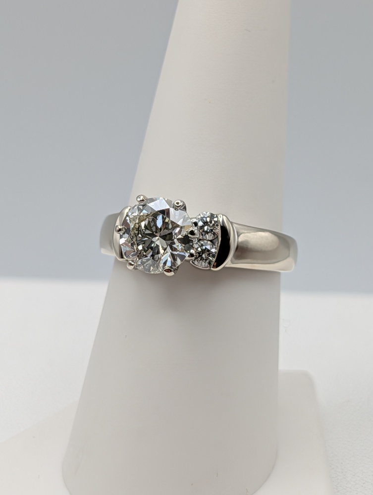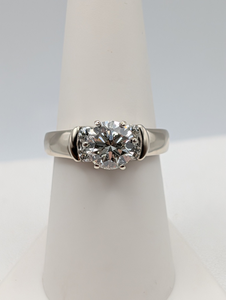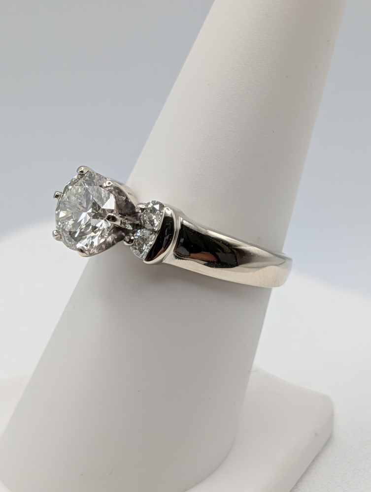 Size 7.5 14kt White Gold ~1.5 Carat J Color; SI3 Clarity Round Brilliant Cut Diamond Center With ~.20 Total Carat Weight Round Brilliant Cut Diamond Side Accents Cathedral Set Ring - 6.10 Grams