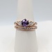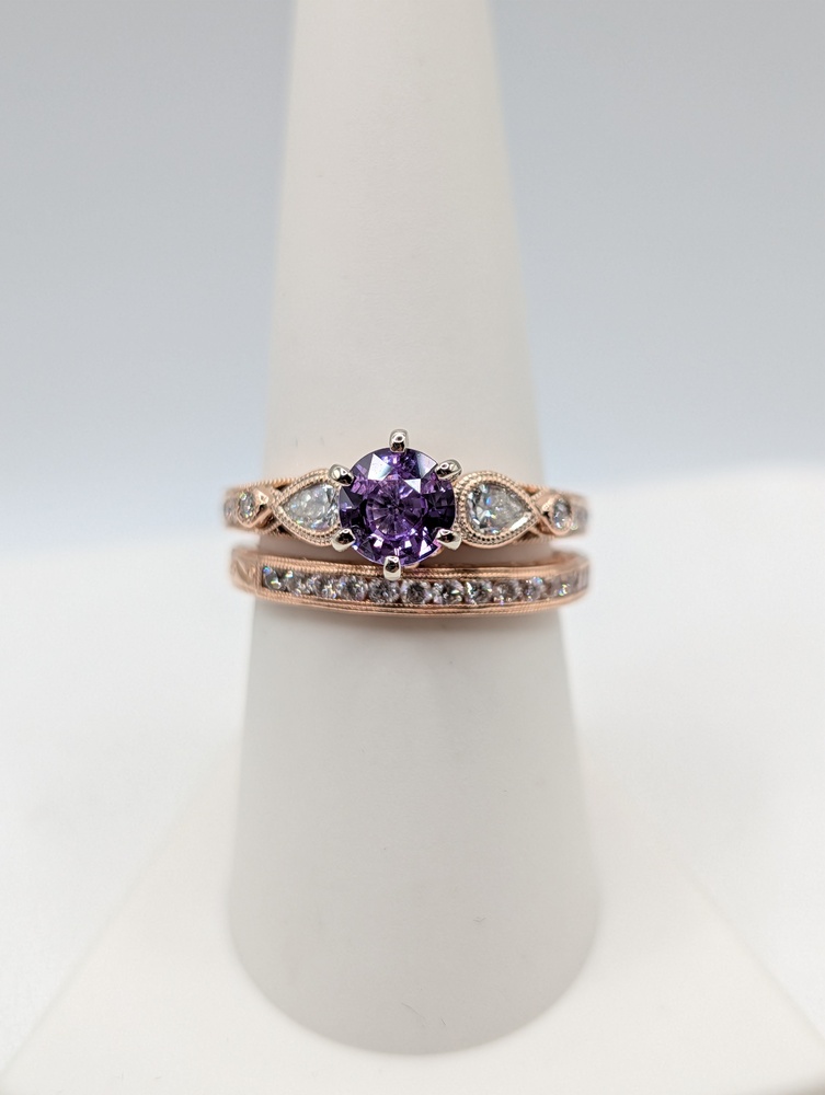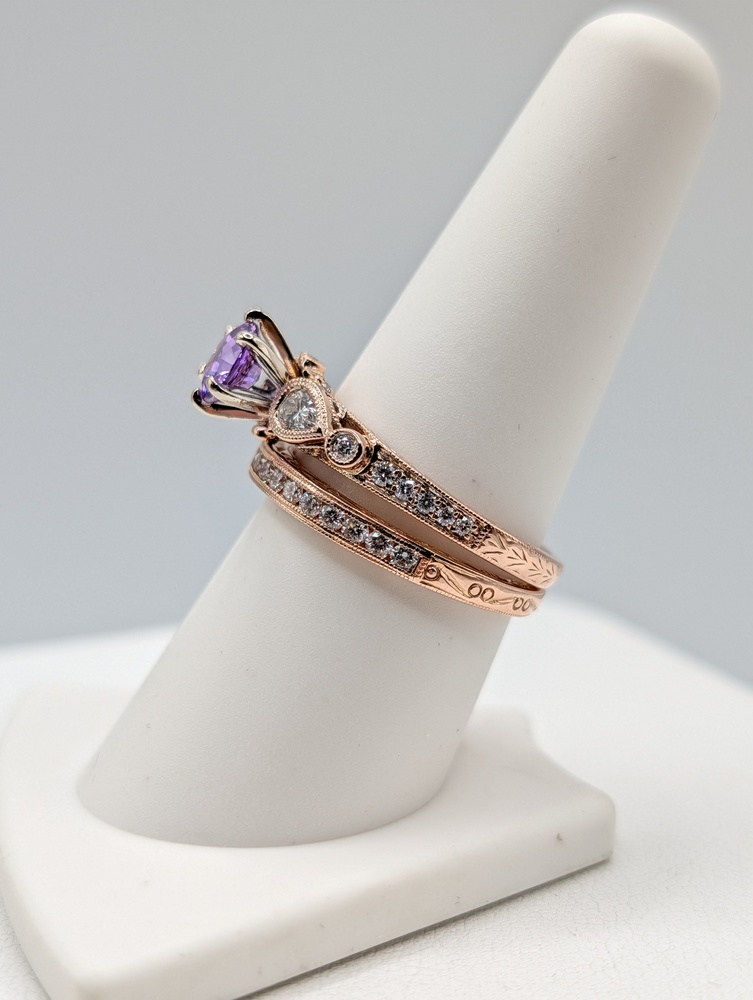 Size 8 14kt Rose Gold ~1.2 Carat Round Pink Sapphire With ~.40 Total Carat Weight Pear and Round Cut Diamond Bezel and Pave Set Accents in Engraved Detail Ring With ~.35 Total Carat Weight Round Cut Diamond Accent Matching Band Ring Set - 6.50 Grams