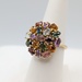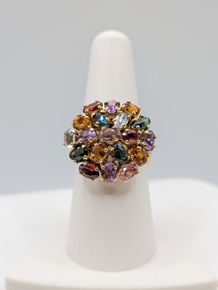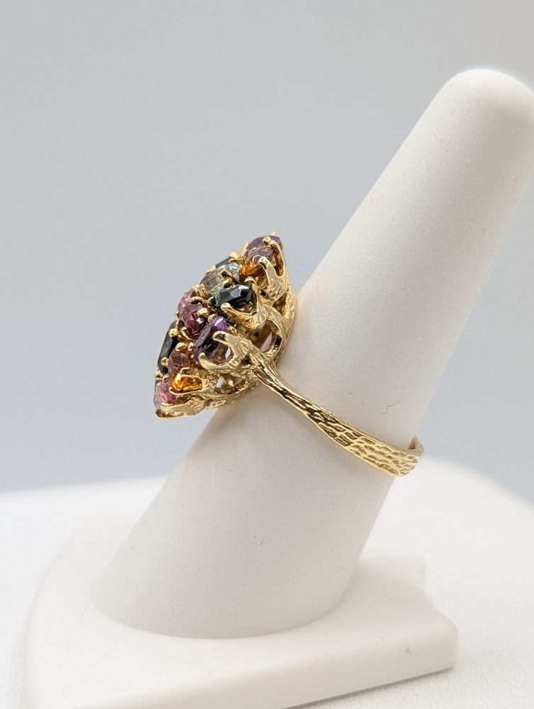 Size 8 18kt Yellow Gold ~3 Total Carat Weight Oval Garnet; Citrine; Amethyst; Tourmaline and Aquamarine Round Cluster Top With Etched Design Band Statement Ring - 9.30 Grams