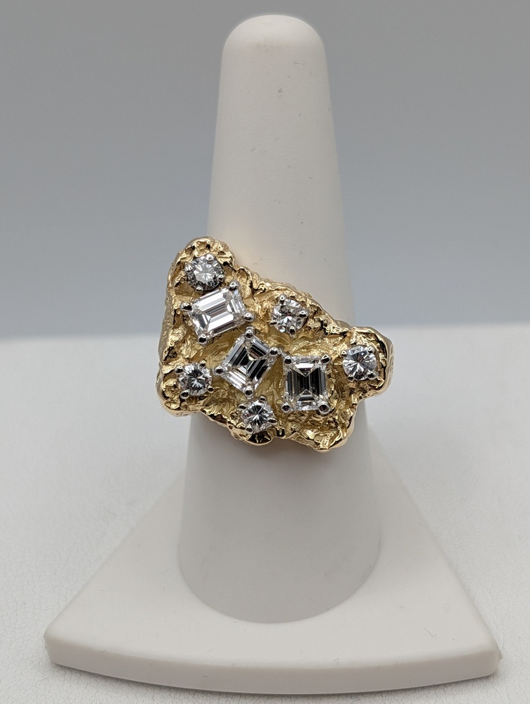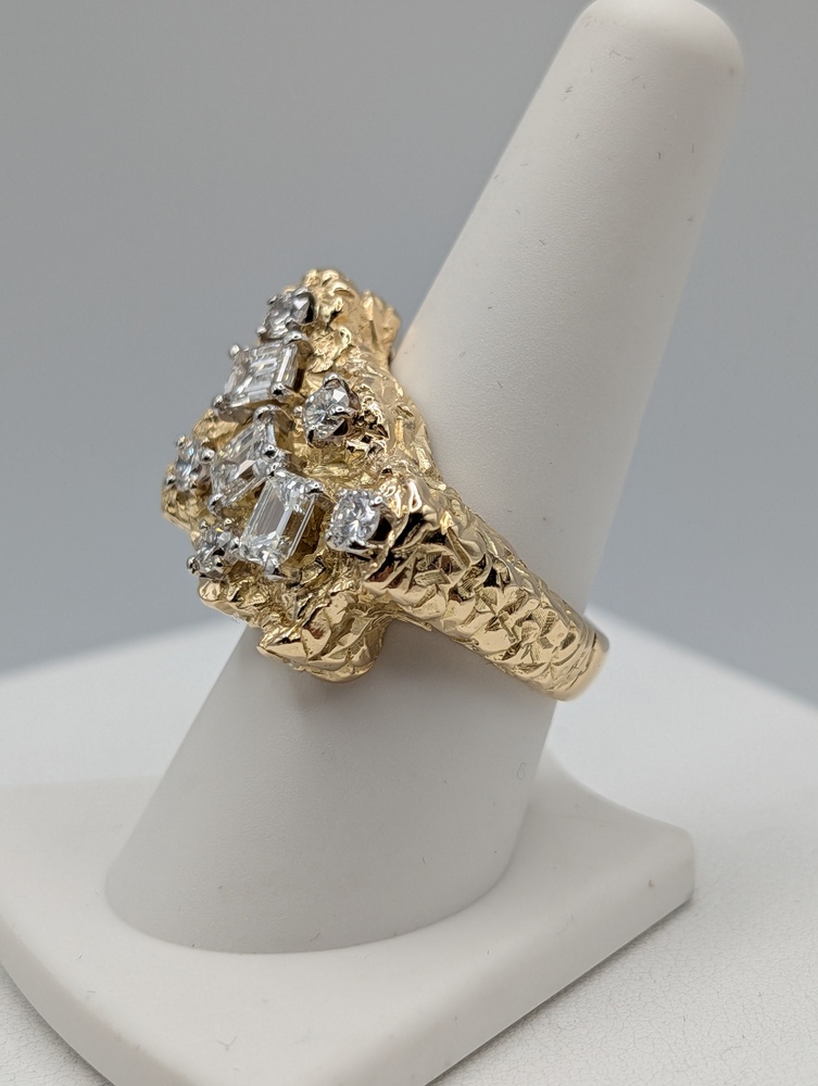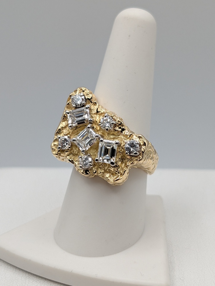 Size 9 18kt Yellow Gold ~3.2 Total Carat Weight G Color; VS1 Clarity Emerald and Round Brilliant Cut Diamond Accent Nugget Ring - 28.40 Grams