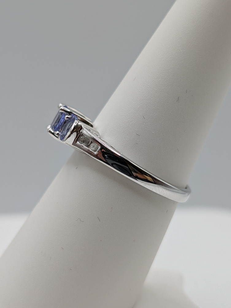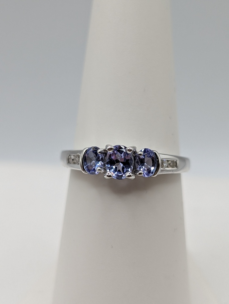 Size 7 10kt White Gold ~.50 Total Carat Weight Oval 3-Tanzanite Center With Round Cut Diamond Side Accent Ring - 2.40 Grams
