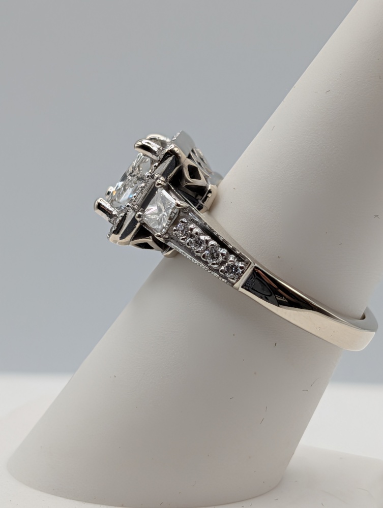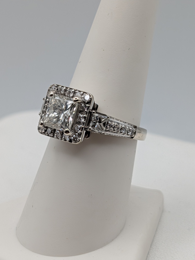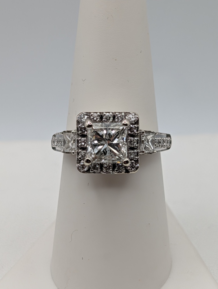 Size 7.5 14kt White Gold ~1.4 Carat J Color; SI3 Clarity Princess Cut Diamond Center With ~1 Total Carat Weight Princess and Round Brilliant Cut Diamond Halo and Shoulder Accents Ring - 7.90 Grams